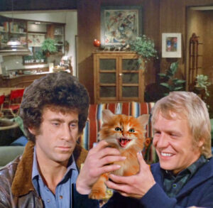 He wasn’t even halfway there when once again the kitten let out a hysterical caterwaul. Starsky and Hutch both jumped, and Starsky turned around and marched back to the bathroom door, opened it and scooped the kitten off the floor before it could damage his ears any more.